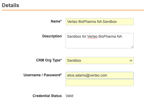 Enter the appropriate username and password for the integration user with Vault CRM.
