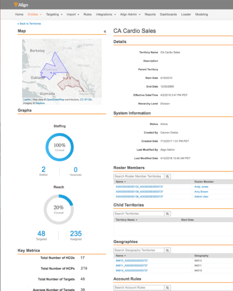 Sales metrics can be displayed in the Territory Information Bar, enabling Align administrators to view insights on how a product is prescribed by targets and accounts when making territory adjustments.