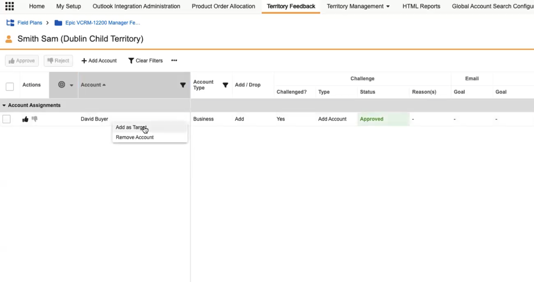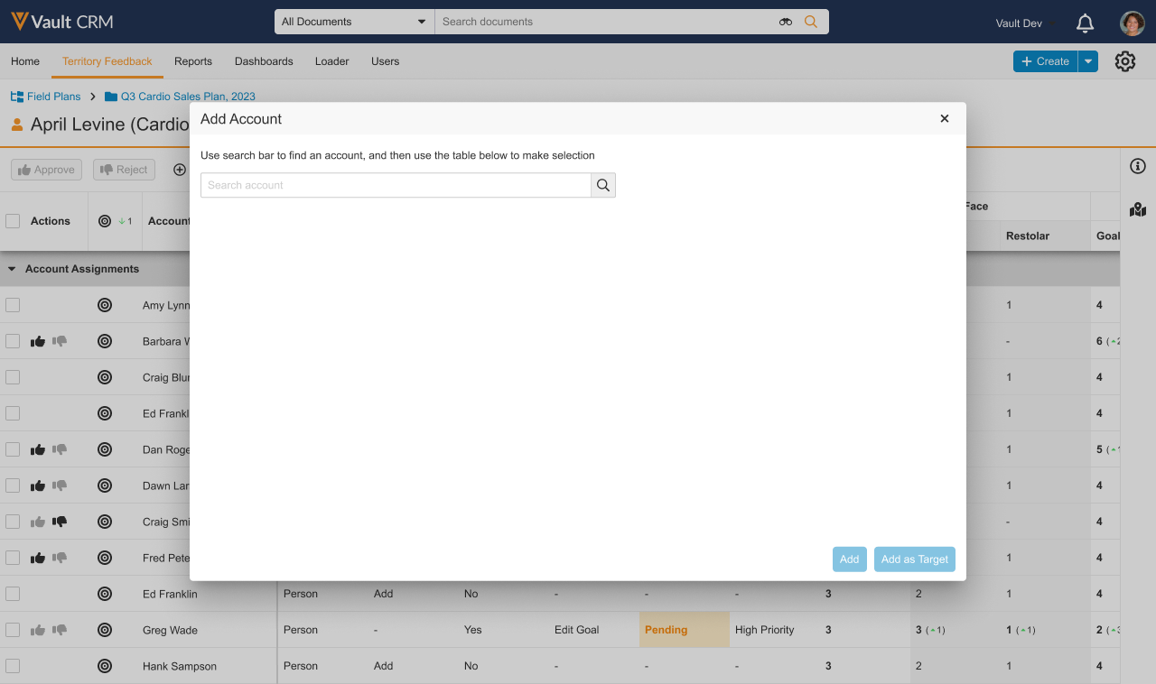 Managers can search for and directly add accounts to a territory via the Accounts screen in Manager Feedback. To search for and add an account to a territory: