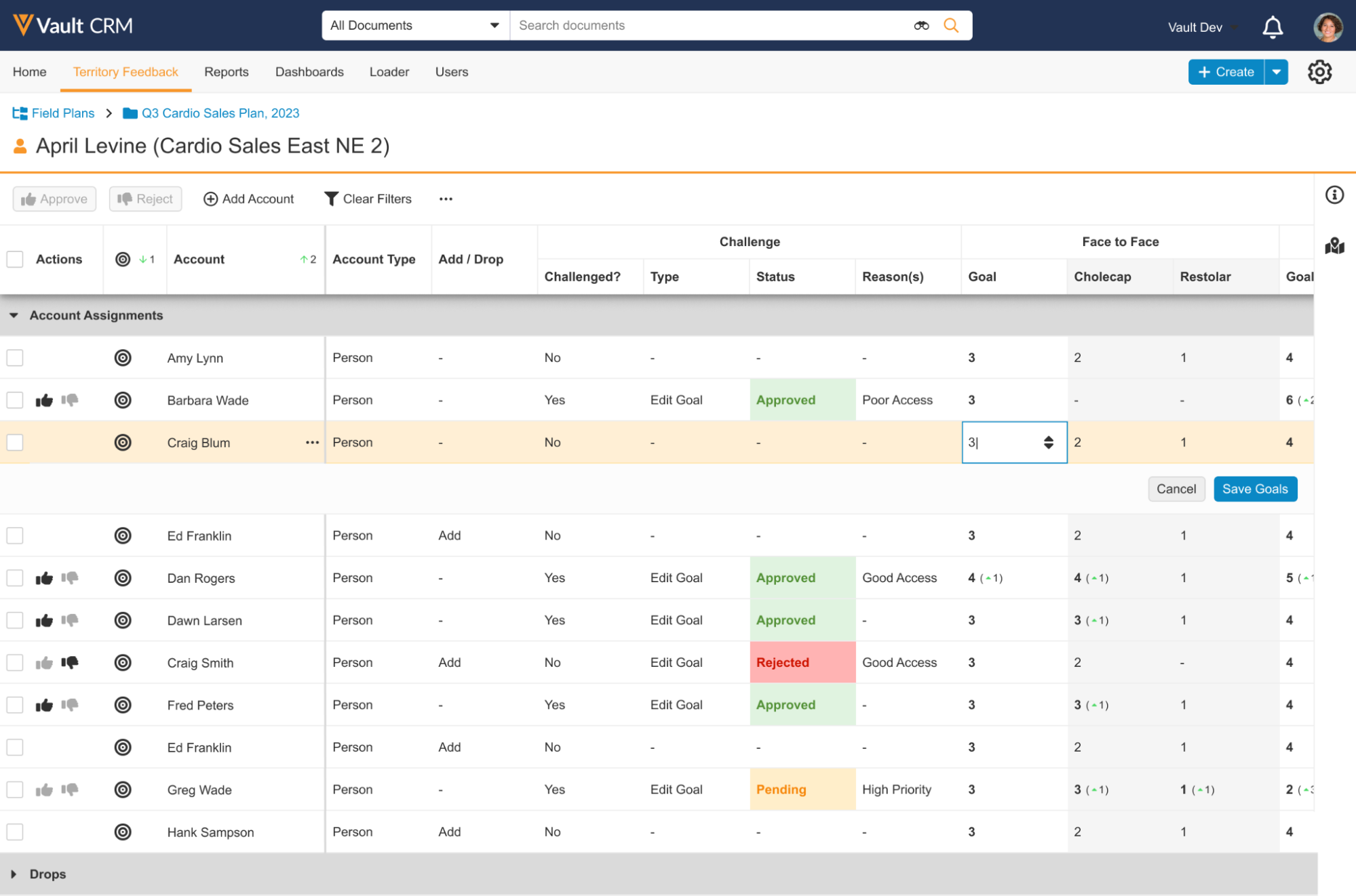 If an account is marked as a target, managers can create Edit Goals challenges to adjust the target’s product and channel goals: