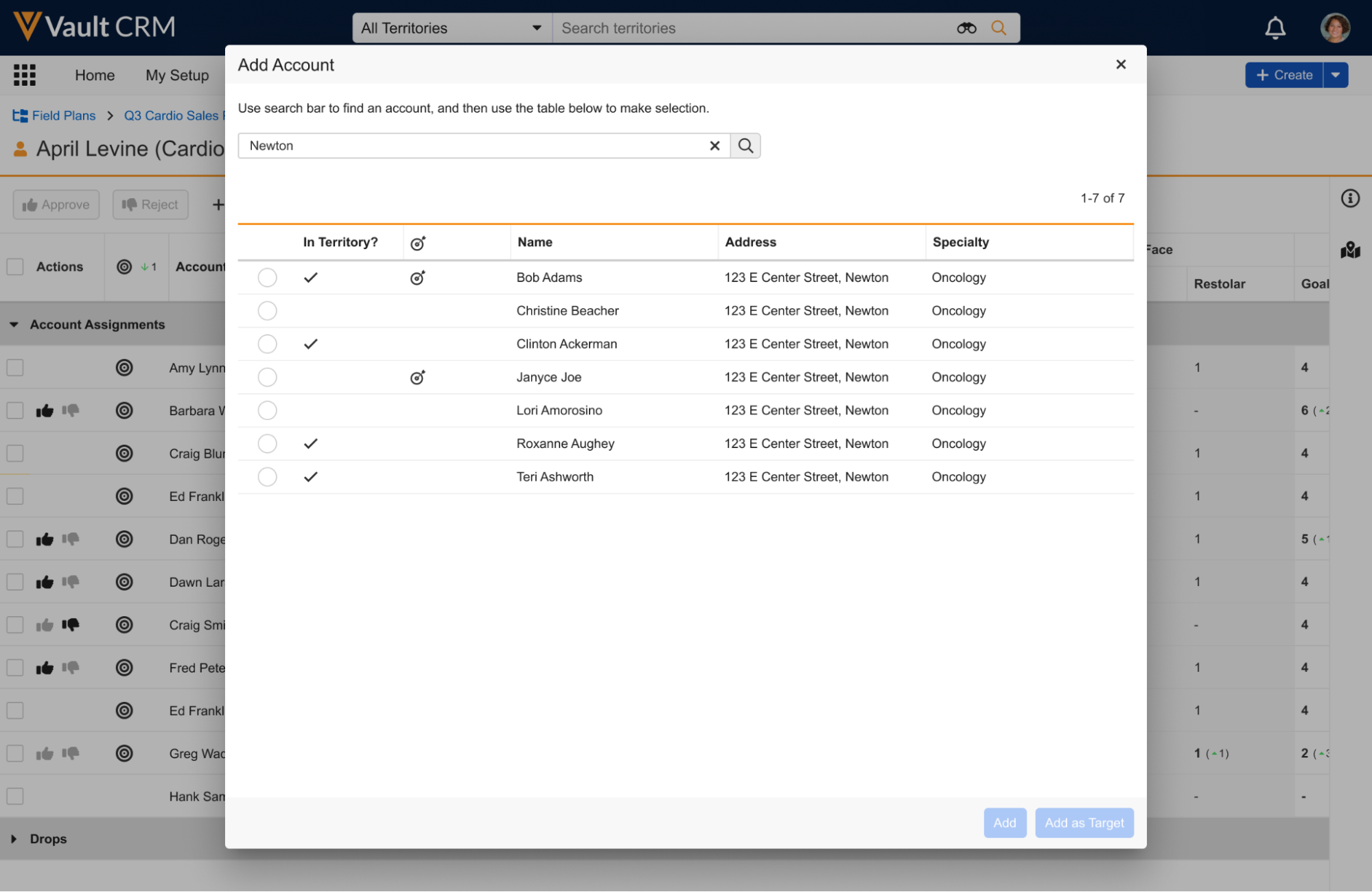 - Add as Target – Adds the account to the territory as a target. Adding an account as a target immediately navigates managers to editing the goals of the new target. Default goals automatically populate for each metric prior to the manager editing each goal.