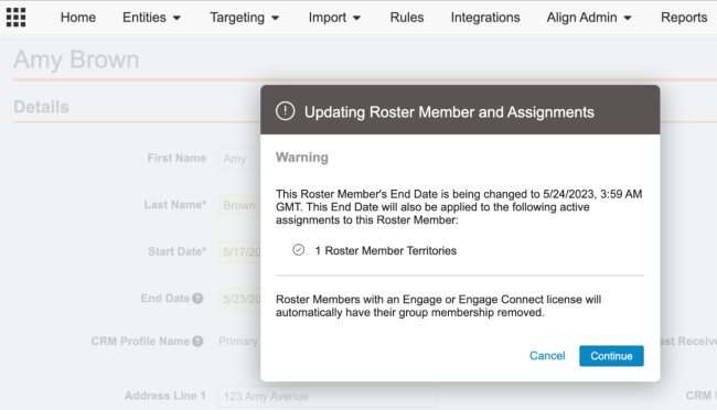 If a roster member is either manually inactivated in Align by updating the crm_user_status__aln field to inactive__aln, or if the roster member record is inactivated due to the record being end-dated, they are automatically removed from their Engage and Engage Connect groups during the next push to CRM.